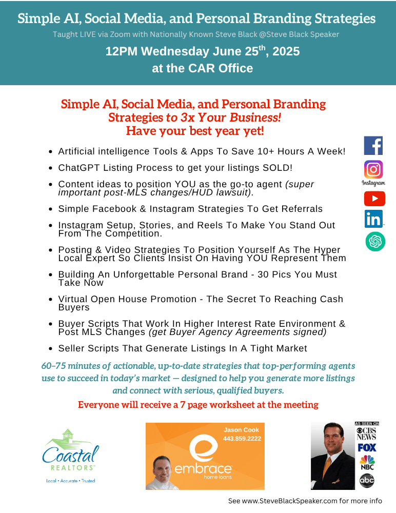 Are you ready to stand out, get more listings, and work smarter in today’s changing real estate landscape? Join us for an action-packed, high-energy training taught LIVE via Zoom with nationally recognized speaker Steve Black! Discover how top-performing agents are thriving using the latest AI tools, social media strategies, and personal branding techniques — and how YOU can too. You’ll learn how to: Save 10+ hours a week using the latest AI tools & apps Use the ChatGPT listing process to get your listings SOLD Generate fresh content that positions YOU as the go-to agent (crucial in the post-MLS lawsuit world) Set up Facebook & Instagram to drive referrals Use Stories and Reels that make you stand out Build a powerful local brand with 30 must-take photos Master virtual open house strategies to attract serious buyers Use updated buyer and seller scripts that work in a high-interest, post-MLS environment PLUS: Everyone in attendance will receive a 7-page worksheet packed with templates and tools you can use immediately! This is the edge you've been looking for — don’t miss it!